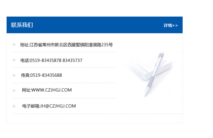 傳真:0519-83435688    郵編:213135    網(wǎng)址:WWW.czjhgj_com.ygptq.com    電子郵箱:JH@czjhgj_com.ygptq.com